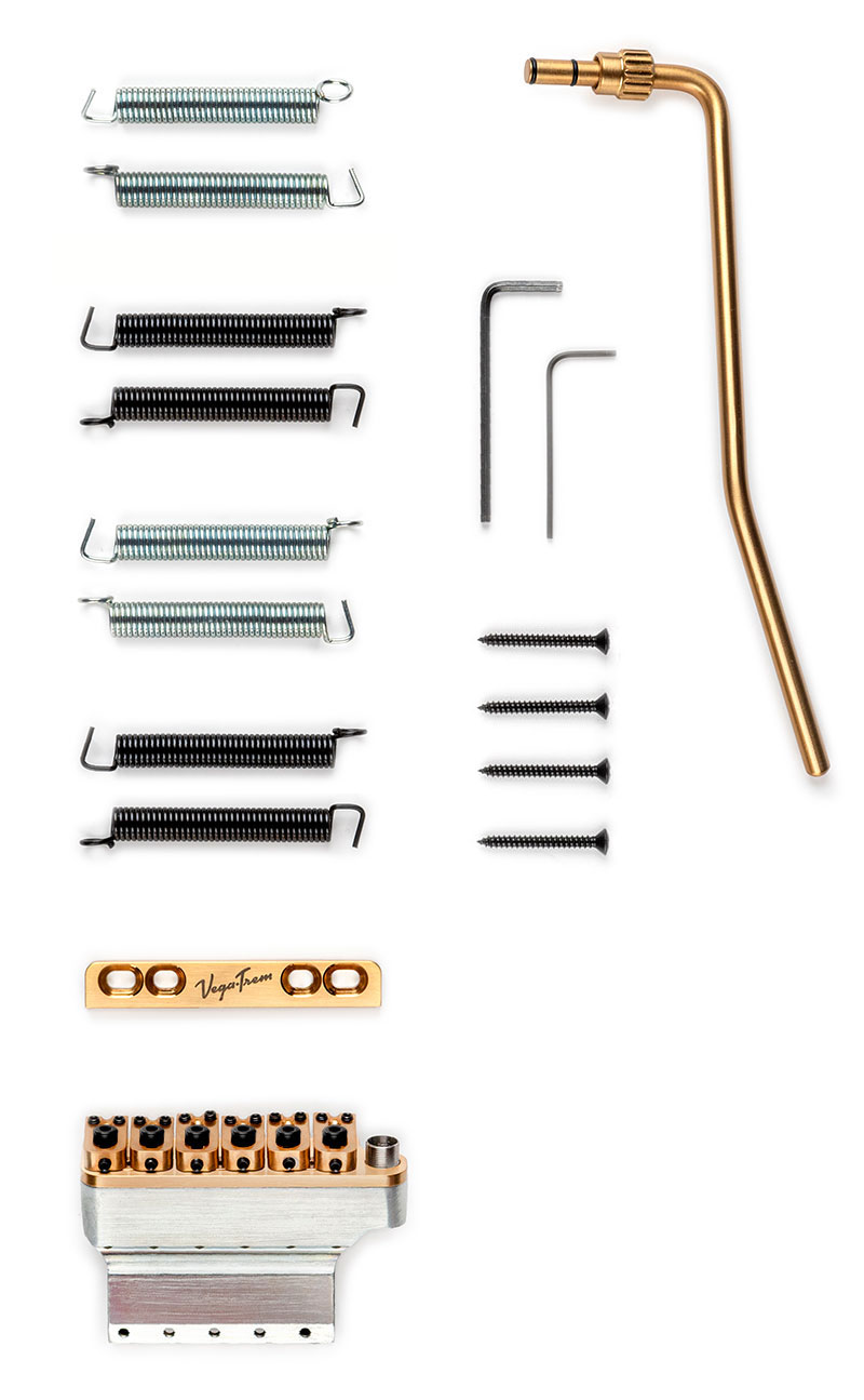 通常の6本ネジで取り付けられているトレモロを搭載したギター用、ブロックは高品質な亜鉛メッキ鋼で作られ、他のパーツは高品質のステンレススチール製。